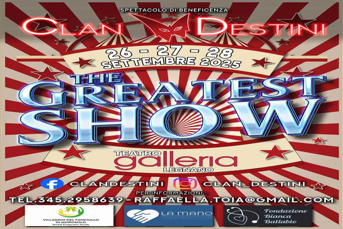 Un unico spettacolo, tre serate e tre associazioni da sostenere. Dal 26 al 28 settembre al Teatro Galleria di Legnano i ClanDestini porteranno in scena “The Greatest Show”, musical ispirato al celebre film “The Greatest Showman”, con l’obiettivo di trasformare l’arte in solidarietà concreta. Ogni data sarà infatti dedicata a una causa diversa: venerdì 26 settembre i fondi raccolti andranno alla cooperativa “La Mano” di Legnano, che crea opportunità di lavoro per persone con disabilità; sabato 27 settembre sarà la volta della “Fondazione Bianca Ballabio”, nata per onorare il sogno di Bianca di diventare medico e oggi impegnata nel sostegno a progetti in ambito sanitario; domenica 28 settembre, infine, l’incasso sarà devoluto al “Villaggio del Fanciullo di Morosolo”, che accoglie mamme e bambini in difficoltà offrendo loro casa, assistenza e nuove prospettive di vita.