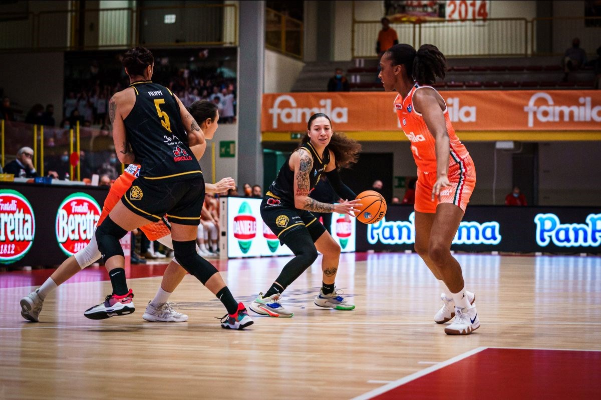 2° QUARTO. Si riparte con un 5-0 firmato ancora Kelley, per l’improvviso -1 di un Fila che ora ha ritrovato la carica. Un paio di ottime giocate di Russo le danno anche il pallone del sorpasso, ma la tripla non entra e dall’altra parte punisce Laksa. Non demordono però le ragazze di Serventi, che sull’onda di una Kelley sempre positiva (12 punti nel secondo periodo) trovano un altro mini break di 7-0: è proprio lei a firmare il 2+1 che regala per la prima volta il vantaggio alle Lupe, sul 25-28 del 17′. Arriva però la riscossa del Famila, che in chiusura prova a scuotersi con Gruda e la bomba di Sottana. Risponde ancora Russo (9 punti e 4 assist uscendo dalla panchina), e all’intervallo lungo l’incontro è in pieno equilibrio sul 33-32.