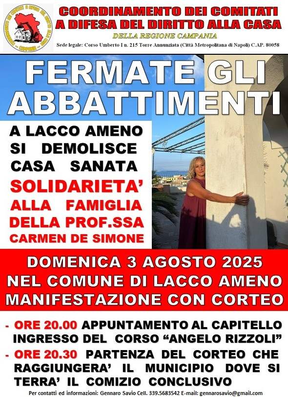 La notizia dell’imminente abbattimento a Lacco Ameno di una casa sanata, sta generando una valanga di solidarietà nei confronti della Famiglia di Carmen De Simone, apprezzatissima, stimatissima e benvoluta professoressa isolana. Di qui il corteo di solidarietà che si terrà domenica prossima 3 agosto nel Comune all’ombra del Fungo. L’appuntamento è per le ore 20.00 in piazza Capitello, alle ore 20.30 partirà il corteo per piazza Santa Restituta dove si terrà il comizio conclusivo e l’incontro con il sindaco Giacomo Pascale.