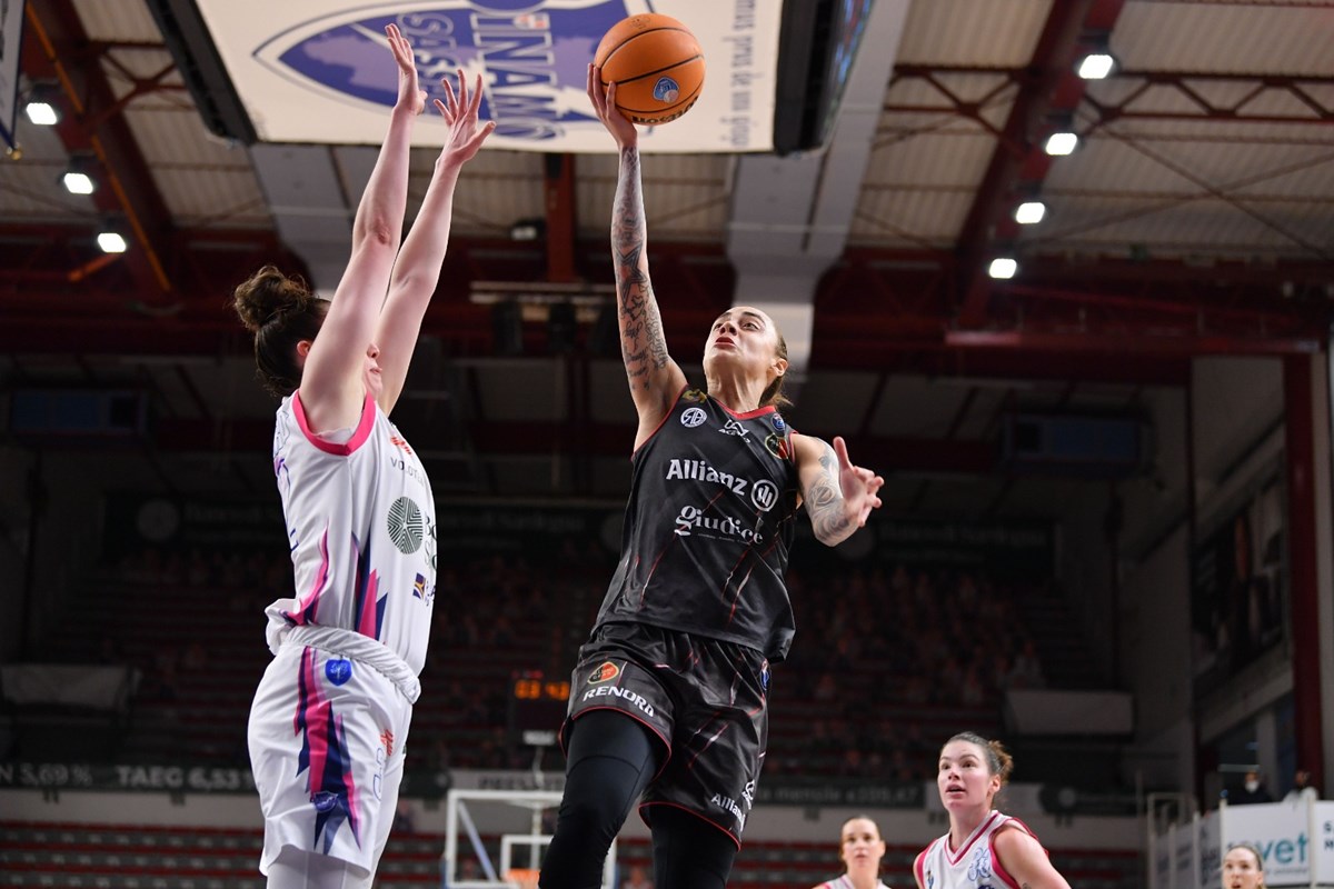 L’Allianz termina con il 48% da due, il 31% da tre e il 91% (11/12) a gioco fermo, disponendo inoltre di più di 10 occasioni complessive al tiro rispetto alle avversarie, frutto di un mix tra i tanti rimbalzi d’attacco (17, su 43 totali, contro 12 su 39) e del minor numero di palle perse, seppur non indifferente, 15 contro 19. Sesto segna su assistenza diretta per ben 26 volte, contro i 16 delle isolane. Mvp del match Jazmon Gwathmey, che ritrova la via del canestro con continuità da diverse zone del campo e che finisce con 25 punti (55% dal campo), 7 rimbalzi, 2 assist e 3 stoppate. Molto bene anche Ivana Raca, che mette a referto 20 punti (46% dal campo), 8 rimbalzi e 5 assist; percentuali positive (5/9 da due, 1/1 dall’arco e 2/2 ai liberi) per Sara Crudo, che fa registrare 15 punti, 5 rimbalzi e 3 assist. Positive anche le prestazioni di Valeria Trucco, brava in difesa a contenere Shepard e autrice di 8 punti (4/5 da due), 9 rimbalzi, 4 assist e 3 stoppate, e di Ilaria Panzera (10 punti, 4 rimbalzi e 3 assist).