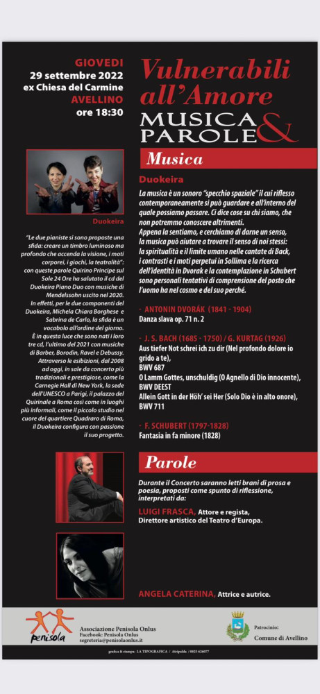 “Vulnerabili all’amore – musica e parole” è una manifestazione, organizzata dall’Associazione Penisola Onlus, che si terrà domani (giovedì 29 settembre) presso l’ex Chiesa del Carmine di Avellino alle ore 18.30.