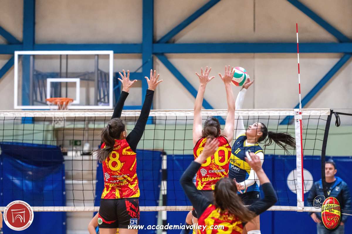 L’avvio è tutto di marca giallorossa: l’Accademia impone subito il proprio ritmo e domina il primo set senza storia, chiuso con un netto 13-25. Nel secondo e nel terzo parziale, però, arriva la reazione delle padrone di casa che riescono prima a pareggiare i conti (25-23) e poi a ribaltare l’inerzia dell’incontro (25-20), approfittando di qualche passaggio a vuoto delle beneventane. Nel quarto set la UniFortunato mostra carattere e compattezza, rimettendo ordine nel proprio gioco e riportando la sfida in equilibrio con un 25-21 che vale il tie break. Il quinto set è un’autentica battaglia. Pontecagnano parte fortissimo e vola sul 5-0, ma l’Accademia non molla e costruisce una rimonta straordinaria, ribaltando la situazione fino al 13-10 a proprio favore. Proprio quando la vittoria sembra a un passo, però, arriva l’ultimo, decisivo sussulto delle salernitane che piazzano il contro-break e chiudono ai vantaggi 16-14.