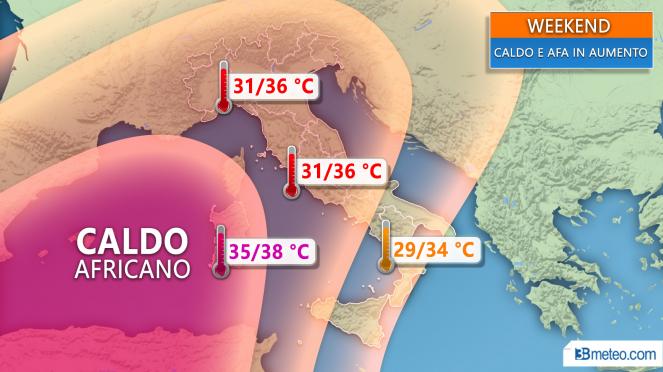 SITUAZIONE. L’ondata di caldo africano che interesserà l’Italia nel corso del weekend e per una buona metà della prossima settimana si profila come la più intensa da quando è cominciata la stagione estiva 2018. A differenza delle due precedenti che hanno dato il massimo sulle regioni meridionali, questa vedrà valori molto alti soprattutto al Centro-Nord perché in una prima fase il Sud risentirà ancora di una debole circolazione di correnti da est. I valori attesi sono ragguardevoli sebbene non eccezionali con picchi fino a 38° o persino superiori su molte zone della Valpadana, della Sardegna e delle pianure centrali tirreniche complicate da condizioni climatiche molto afose. In generale dovrebbe fare meno caldo sul versante adriatico ma non senza afa. Attenzione inoltre a qualche temporale di calore improvviso. Vediamo i dettagli fino a Martedì.