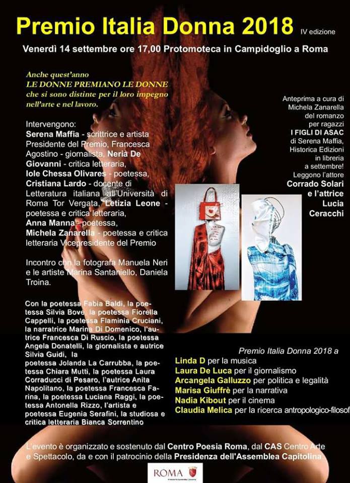 Torna l’appuntamento con uno dei premi più attesi e significativi del mondo femminile. Anche quest’anno le donne premiano le donne che si sono distinte per il loro impegno nell’arte e nel lavoro. Venerdì 14 settembre 2018 alle ore 17 nella Sala Protomoteca in Campidoglio, a Roma, la cerimonia della quarta edizione del Premio Italia Donna, ideato e presieduto da Serena Maffia. Intervengono: Francesca Agostino, giornalista; Neria De Giovanni, critica letteraria; Iole Chessa Olivares, poetessa; Silvia d’Oro, scrittrice; Cristiana Lardo, docente di letteratura italiana all’Università Tor Vergata; Letizia Leone, poetessa e critica letteraria; Serena Maffia, scrittrice, regista e artista; Anna Manna, poetessa; Michela Zanarella, poetessa e critica letteraria Vicepresidente del Premio. Incontro con la fotografa Manuela Neri e le artiste Marina Santaniello, Daniela Troina. Intervengono inoltre: la poetessa Fabia Baldi, la poetessa Silvia Bove, la poetessa Fiorella Cappelli, la poetessa Flaminia Cruciani, la narratrice Marina Di Domenico, l’autrice Francesca Di Ruscio, la poetessa Angela Donatelli, la giornalista e autrice Silvia Guidi, la poetessa Jolanda La Carrubba, la poetessa Chiara Mutti, la poetessa Laura Corraducci di Pesaro, l’autrice Anita Napolitano, la poetessa Francesca Farina, la poetessa Luciana Raggi, la poetessa Antonella Rizzo, l’artista e poetessa Eugenia Serafini, la studiosa e critica letteraria Bianca Sorrentino. Le premiate di questa edizione: Linda D per la musica, Laura De Luca per il giornalismo, Arcangela Galluzzo per politica e legalità, Marisa Giuffrè per la narrativa, Nadia Kibout per il cinema, Claudia Melica per la ricerca antropologico filosofica. Michela Zanarella presenterà in anteprima il nuovo romanzo per ragazzi di Serena Maffia ‘I figli di Asac’ edito da Historica Edizioni, in libreria da settembre. Le letture saranno a cura dell’attrice Lucia Ceracchi e del grande attore Corrado Solari. L’evento è organizzato e sostenuto dal Centro Poesia Roma, dal CAS Centro Arte e Spettacolo, da e con il patrocinio della Presidenza dell’Assemblea Capitolina.