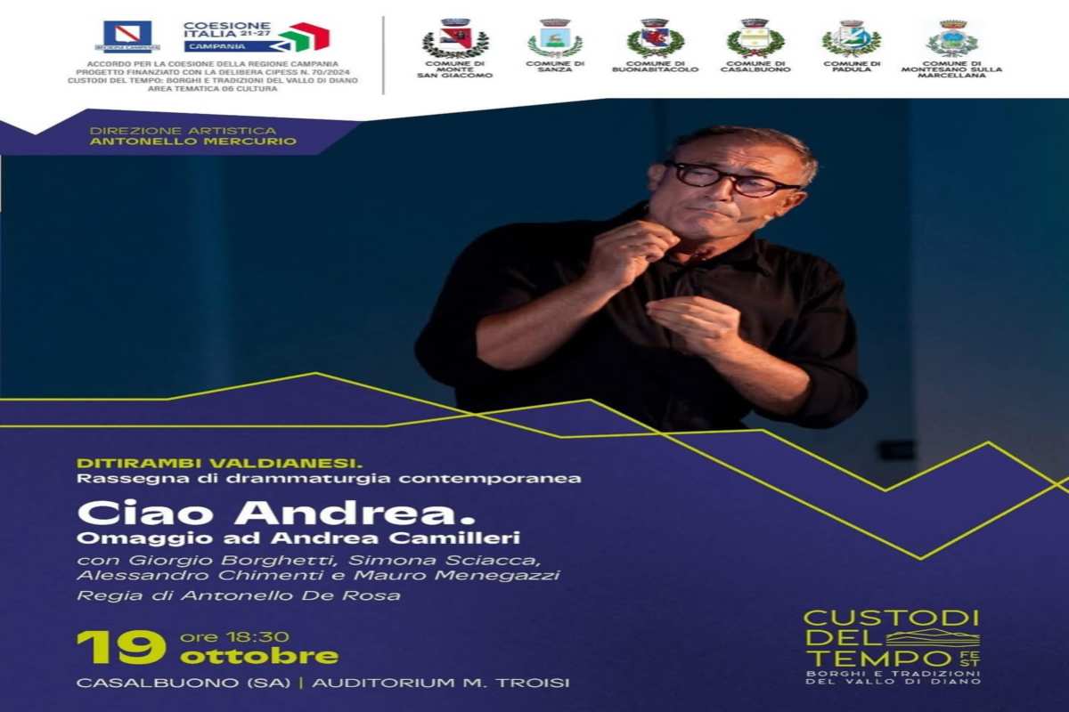 Un testo teatrale scritto di impeto da Pasquale Petrosino e Antonello De Rosa, subito dopo la morte di Andrea Camilleri. Un itinerario tra parole e suoni che sarà portato in scena con la presenza straordinaria dell’attore Giorgio Borghetti domenica 19 ottobre alle ore 18:30 presso l’Auditorium Massimo Troisi (Via Roma, 7) di Casalbuono, in provincia di Salerno con ingresso libero.