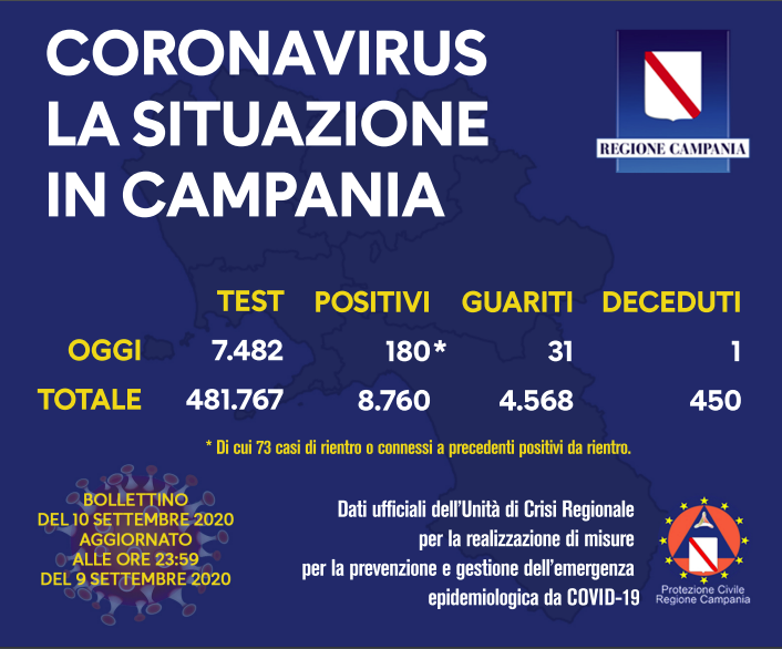 Corona Virus Campania: Totale Positivi: 8.760 i deceduti 450