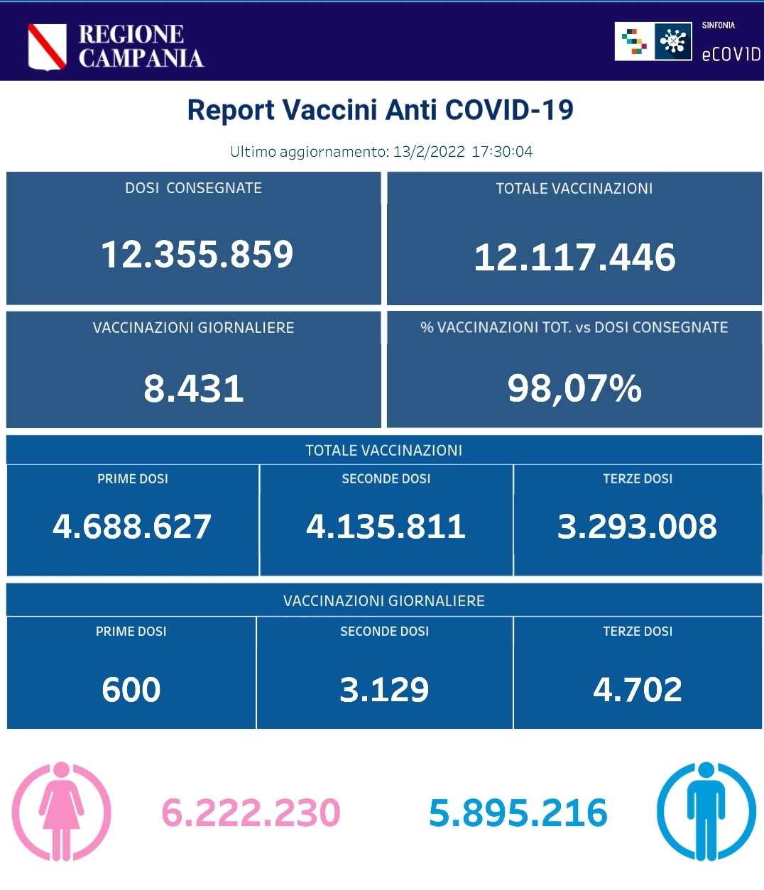 Ecco i dati delle vaccinazioni in Campania aggiornati alle ore 17.30 del 13 febbraio 2022.