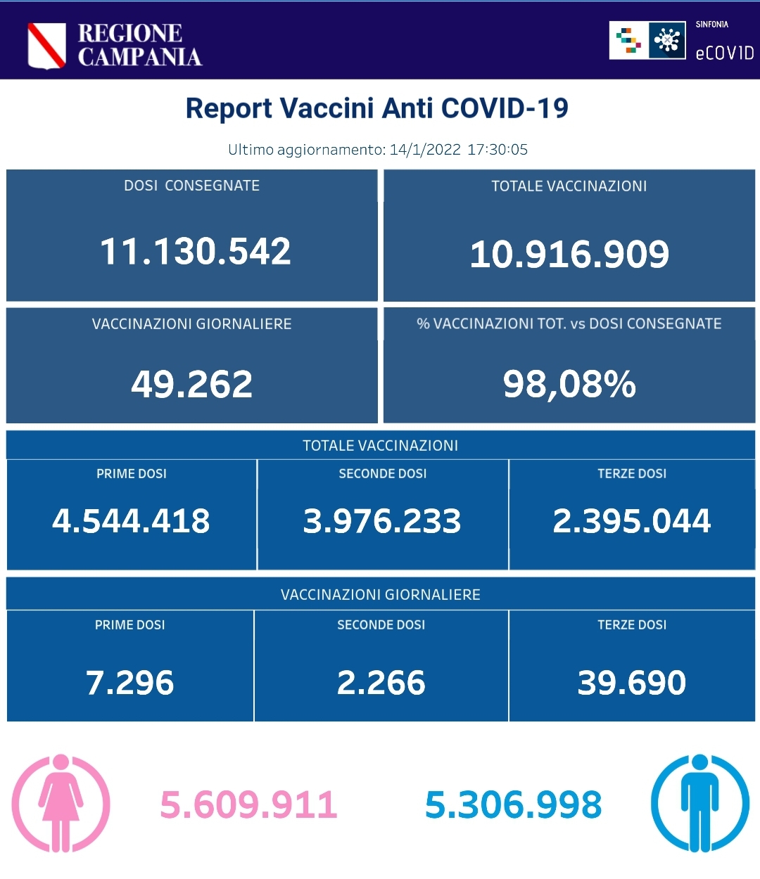 Ecco i dati delle vaccinazioni in Campania aggiornati alle ore 17.30 del 14 gennaio 2022.