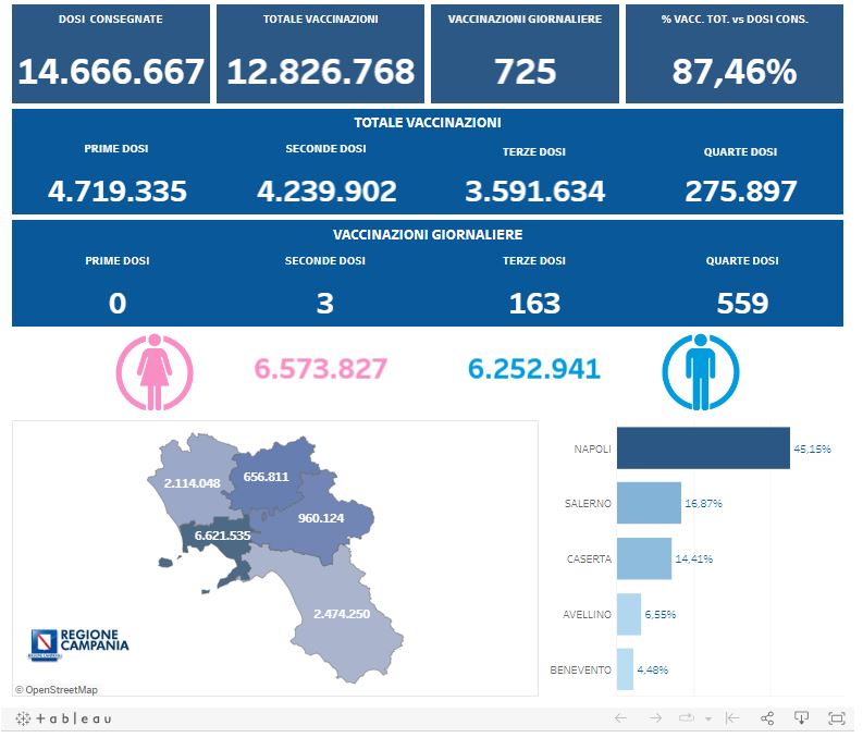 Complessivamente sono state effettuate 4.719.335 vaccinazioni con prima dose, 4.239.902 con seconda dose, 3.591.634 con terza dose e 275.897 con quarta dose.