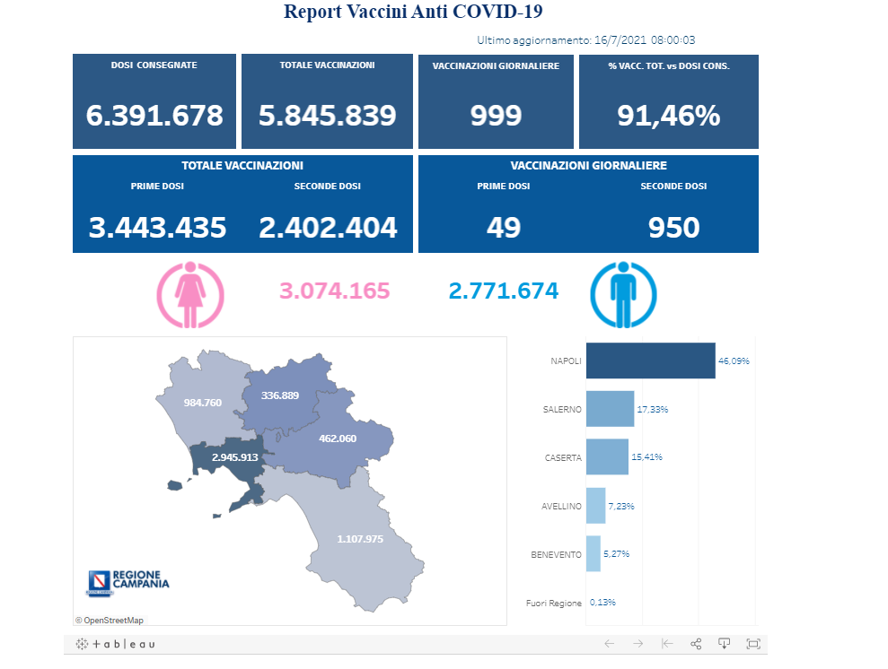 Si comunicano i dati delle vaccinazioni in Campania aggiornati alle ore 8.00 del 16 luglio 2021.