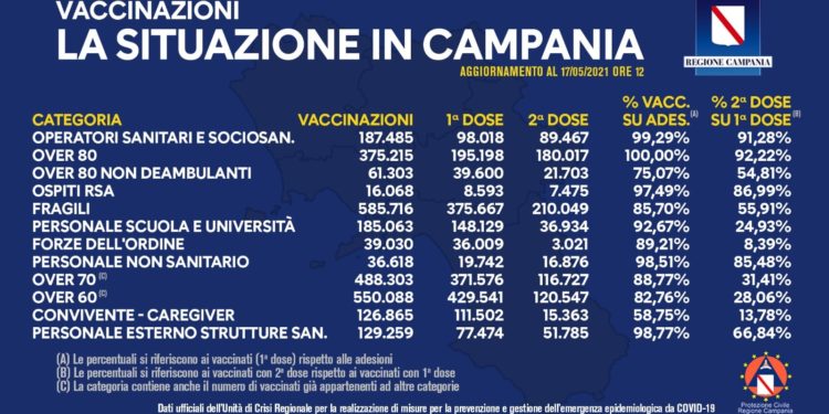 Unità di Crisi Campania: Si comunicano, i dati delle vaccinazioni in Campania aggiornati alle ore 12 del 17 maggio 2021.