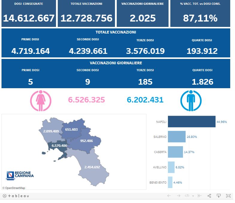Complessivamente sono state effettuate 4.719.164 vaccinazioni con prima dose, 4.239.661 con seconda dose, 3.5756.019 con terza dose e 192.912 con quarta dose.
