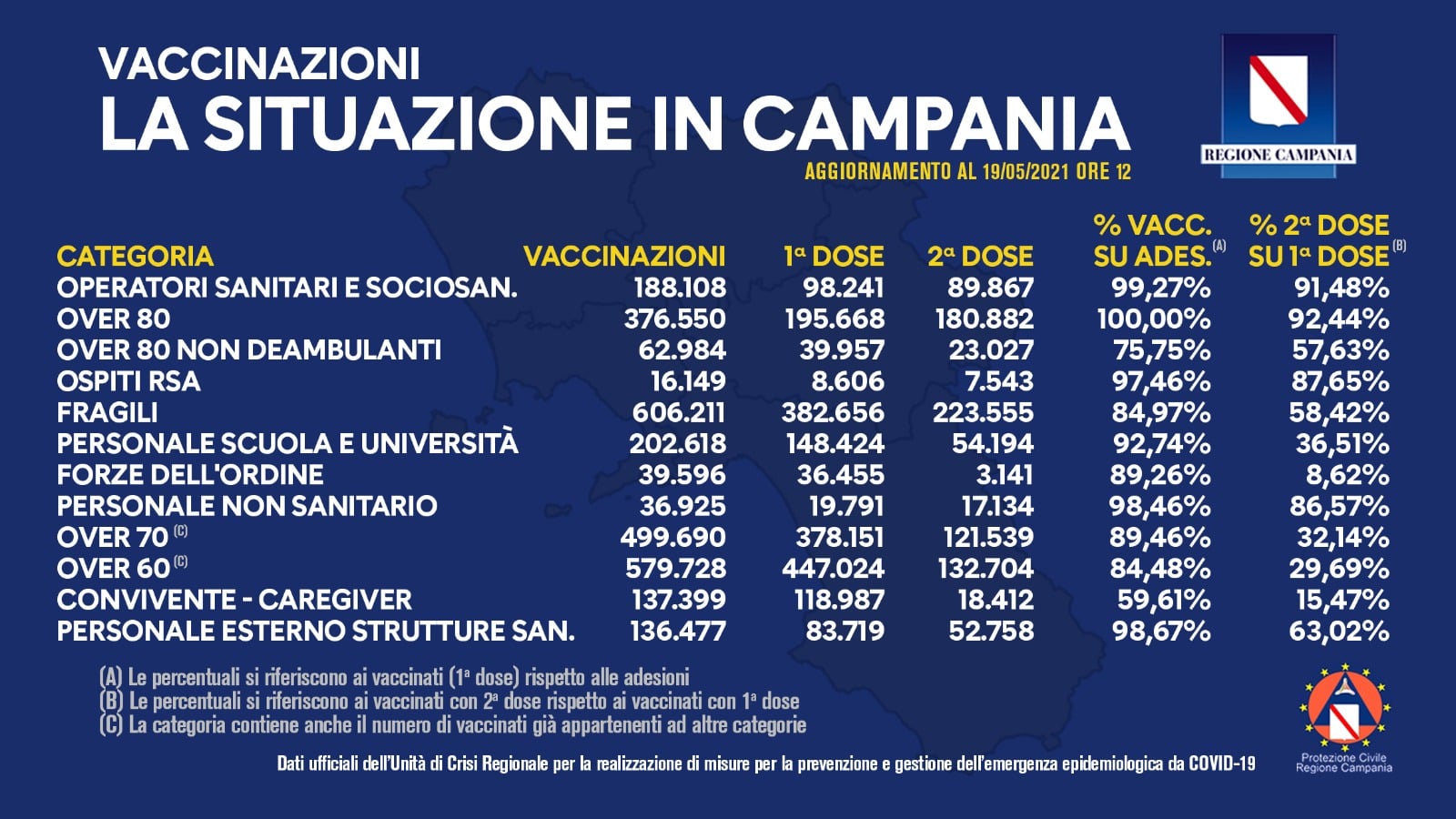 Unità di Crisi Campania: Si comunicano, i dati delle vaccinazioni in Campania aggiornati alle ore 12 del 19 maggio 2021.