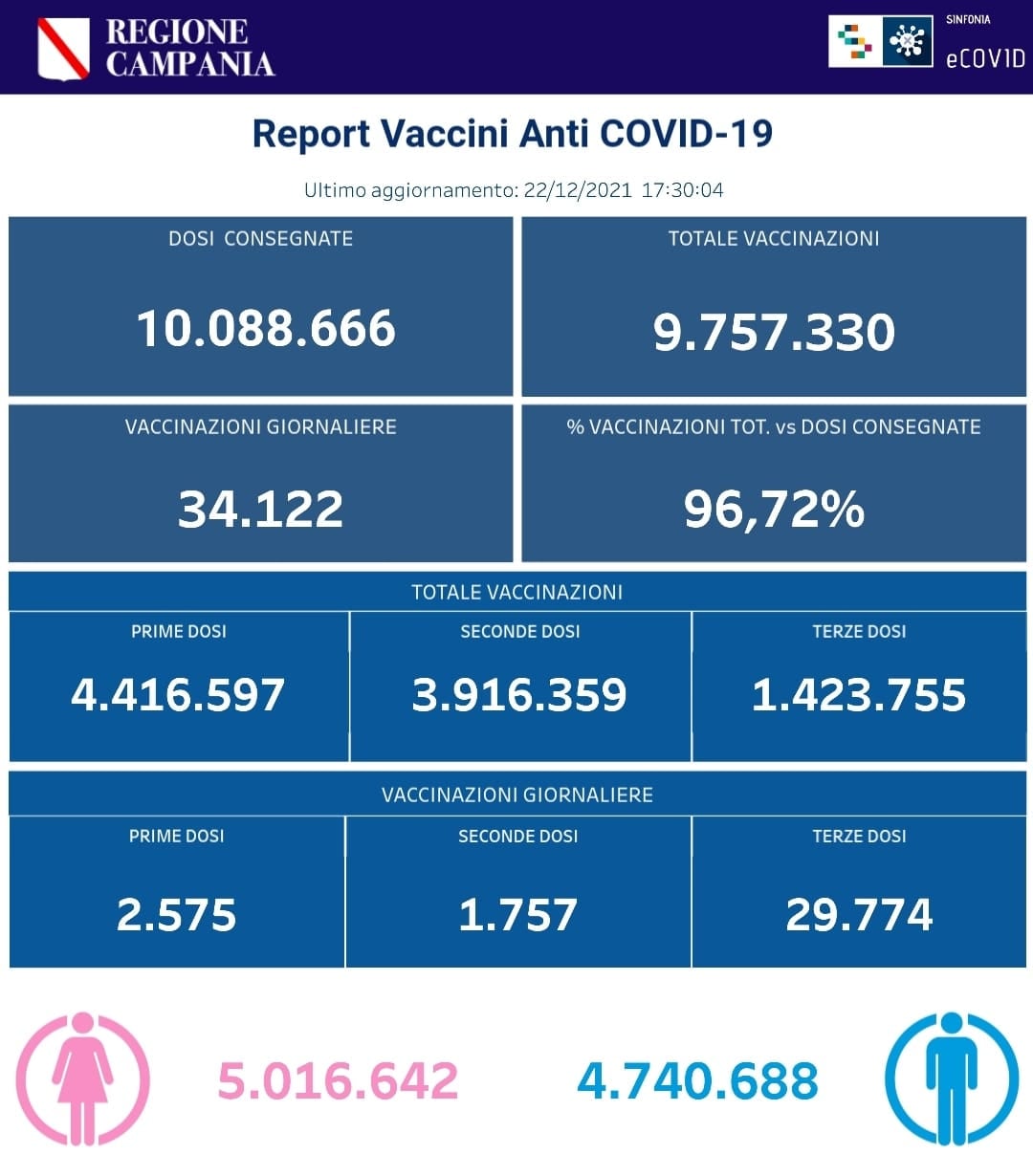 Ecco i dati delle vaccinazioni in Campania aggiornati alle ore 17.30 del 22 dicembre 2021.