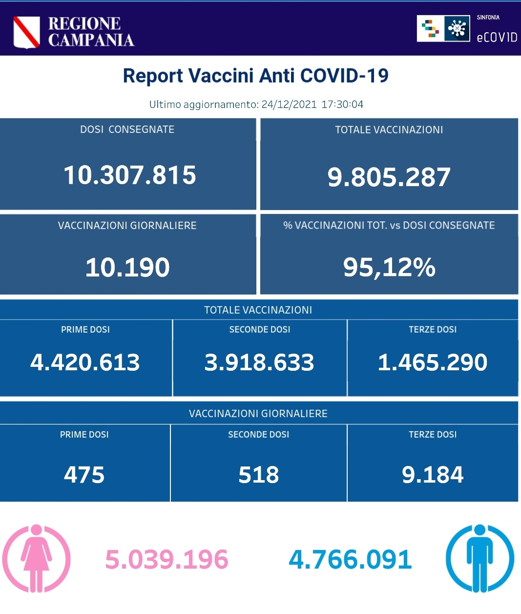 Ecco i dati delle vaccinazioni in Campania aggiornati alle ore 17.30 del 24 dicembre 2021.