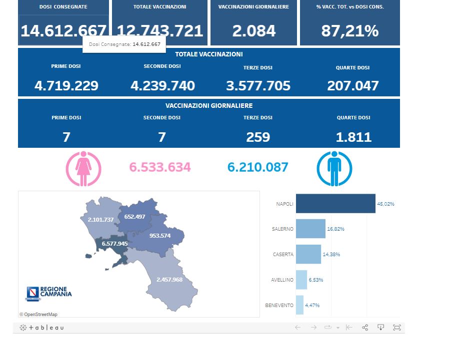 Complessivamente sono state effettuate 4.719.229 vaccinazioni con prima dose, 4.239.740 con seconda dose, 3.577.705 con terza dose e 207.047 con quarta dose.