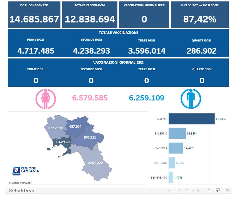 Complessivamente sono state effettuate 4.717.485 vaccinazioni con prima dose, 4.238.293 con seconda dose, 3.596.014 con terza dose e 286.902 con quarta dose.