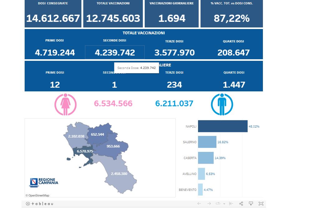 Complessivamente sono state effettuate 4.719.244 vaccinazioni con prima dose, 4.239.742 con seconda dose, 3.577.970 con terza dose e 208.647 con quarta dose.