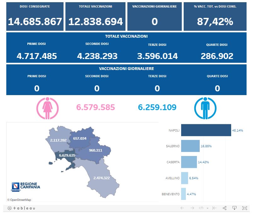 Complessivamente sono state effettuate 4.717.485 vaccinazioni con prima dose, 4.238.293 con seconda dose, 3.596.014 con terza dose e 286.902 con quarta dose.