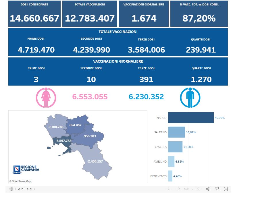 Complessivamente sono state effettuate 4.719.4670 vaccinazioni con prima dose, 4.239.990 con seconda dose, 3.584.006 con terza dose e 239.941 con quarta dose.
