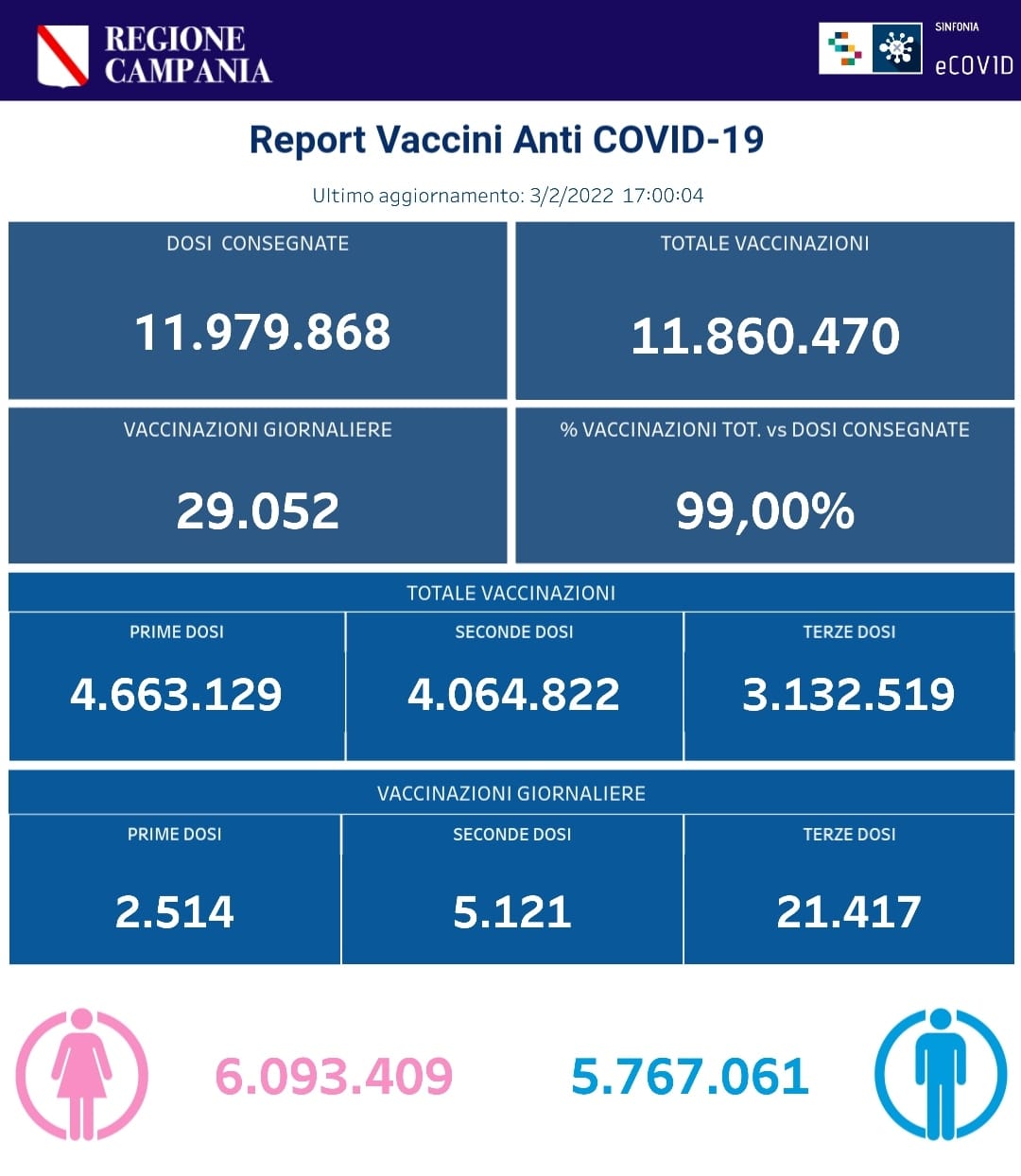 Ecco i dati delle vaccinazioni in Campania aggiornati alle ore 17 del 3 febbraio 2022.