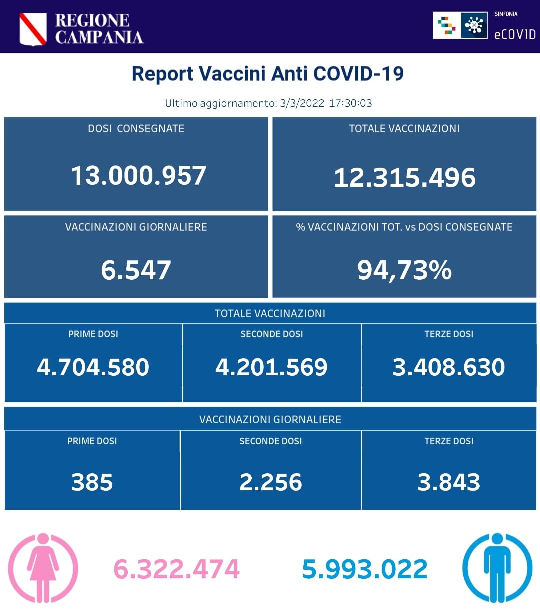 Ecco i dati delle vaccinazioni in Campania aggiornati alle ore 17.30 del 3 marzo 2022.