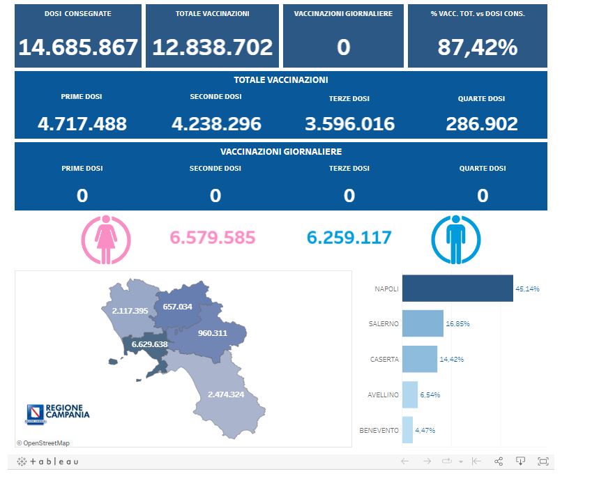 Complessivamente sono state effettuate 4.717.488 vaccinazioni con prima dose, 4.238.296 con seconda dose, 3.596.016 con terza dose e 286.902 con quarta dose.