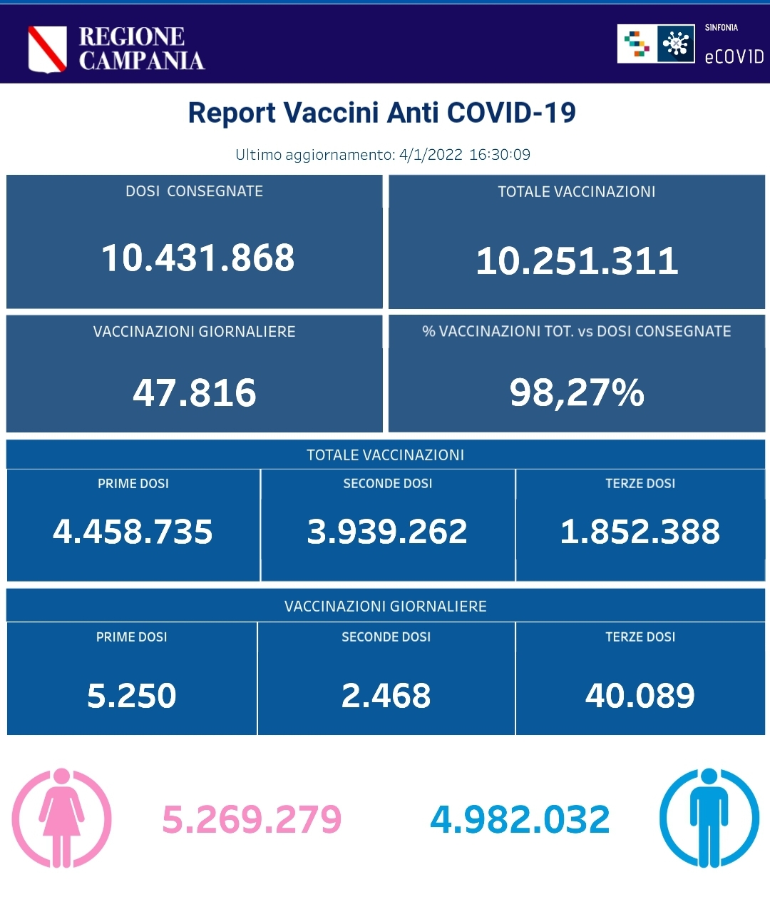 Ecco i dati delle vaccinazioni in Campania aggiornati alle ore 16.30 del 4 gennaio 2022.
