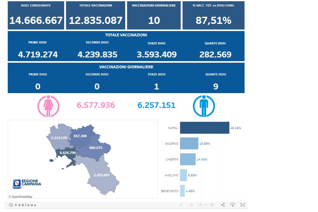 Complessivamente sono state effettuate 4.719.274 vaccinazioni con prima dose, 4.239.835 con seconda dose, 3.593.409 con terza dose e 282.569 con quarta dose.