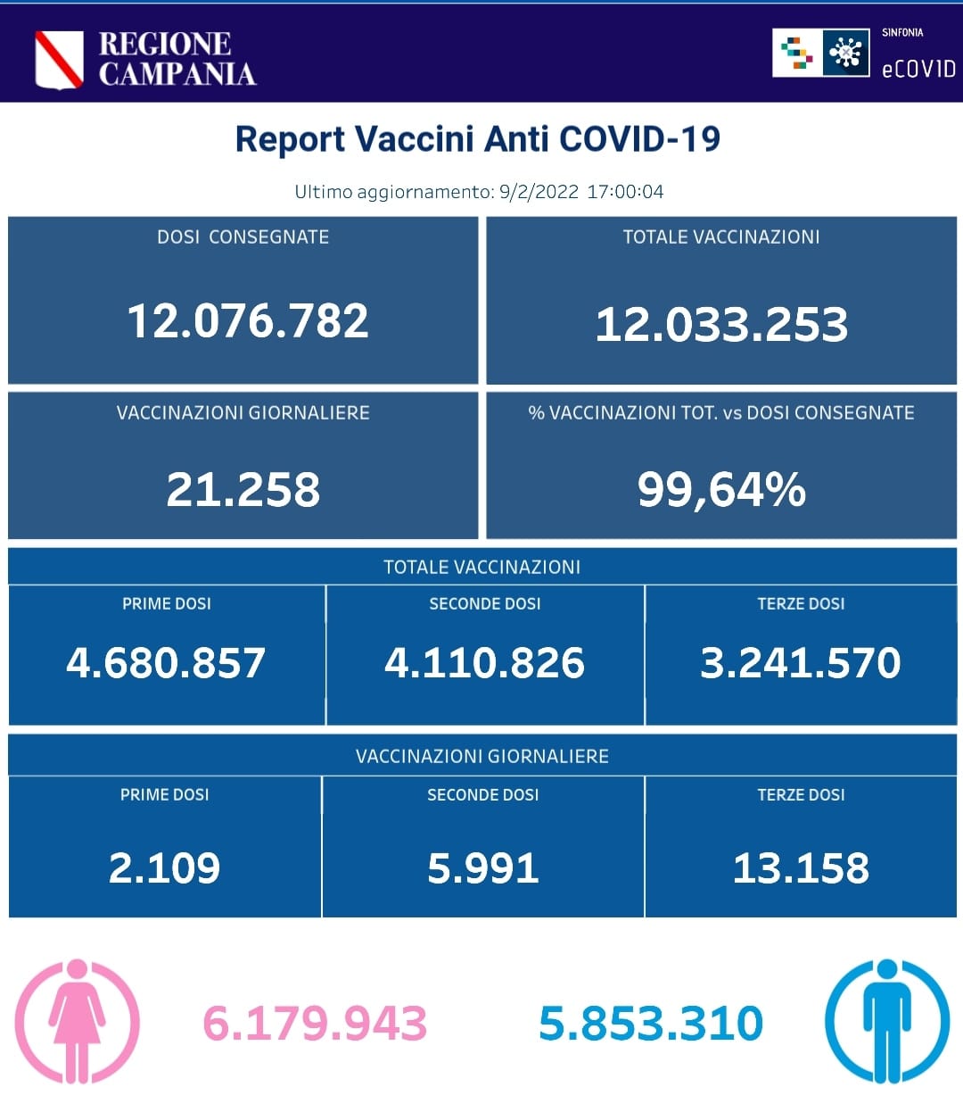 Ecco i dati delle vaccinazioni in Campania aggiornati alle ore 17.00 del 9 febbraio 2022.