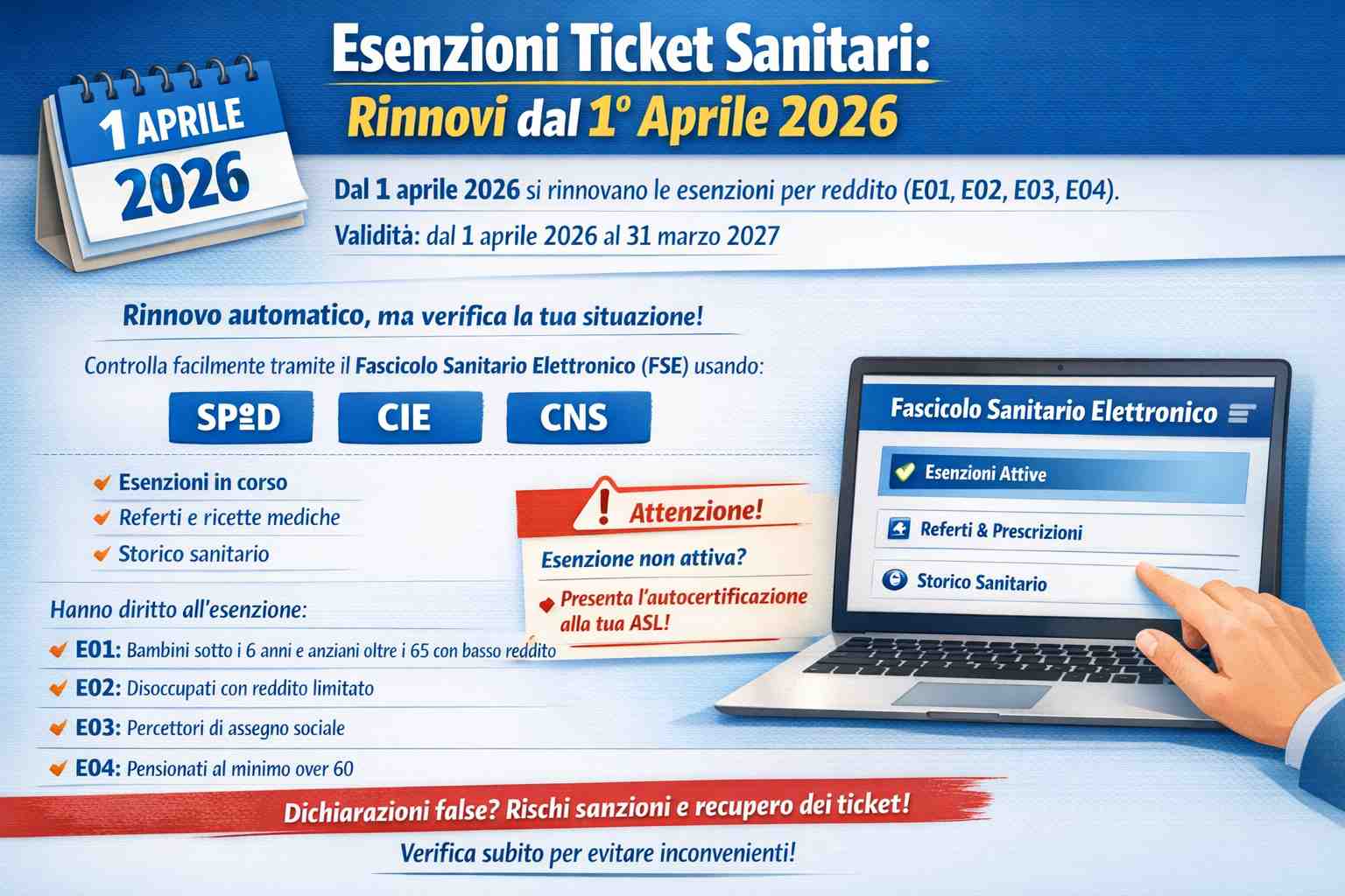 A partire dal 1° aprile 2026 entra in vigore il nuovo periodo annuale delle esenzioni ticket sanitario per motivi di reddito. Le agevolazioni, identificate dai codici E01, E02, E03 ed E04, resteranno valide fino al 31 marzo 2027.