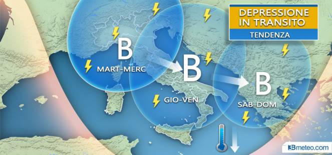 Tra martedì 12 e mercoledì 13 la depressione raggiungerà le regioni centrali dello Stivale. Ci attendono così due giornate instabili al Centro Nord con acquazzoni e temporali irregolari alternati a temporanee pause asciutte e brevi schiarite. Non sono da escludersi fenomeni localmente forti, accompagnati da grandinate e colpi di vento. Il tutto accompagnato da un netto abbassamento delle temperature, specie nelle zone interessate dalle precipitazioni. Ancora discreto al Sud, salvo primi fenomeni sulle Tirreniche meridionali.
