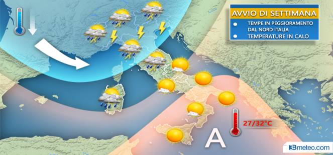 Lunedì un fronte dipartirà dalla depressione raggiungendo le regioni settentrionali, Sardegna e parte del Centro. Esso rinnoverà così rovesci e temporali sparsi al Nordovest, specie settori alpini e prealpini, ma localmente entro sera anche al Nordest. Proseguirà invece l’estate sul resto dello Stivale con massime oltre i 30°C al Sud.