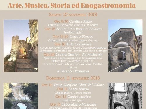 Si parte sabato 10 novembre alle 9.30, presso la Cantina Rizzo, con l’incontro “Felitto e il vino” con Dionisia De Santis. Alle 15 si prosegue con una visita presso il “Salumificio Rosetta Galasso”, alla scoperta dei prodotti tipici felittesi, e alle 16.30 visita guidata nel centro storico di Felitto con punto di incontro in Piazza Mercato. Alle 18, all’interno dell’aula consiliare, sarà presentato il volume “Ideali e realtà dell’epopea sanfedista”, a cura dell’associazione “Identità alta terra di lavoro”. La giornata si concluderà nel centro storico, in via Posterola, con un aperitivo e l’apertura degli stand con lavorazione del lino, filatura della lana, creazione dei ferri per fusilli, lavorazione del fusillo, mostra di ricami, esposizioni pittoriche e tanto altro. La serata sarà allietata dai “Komitiva”.