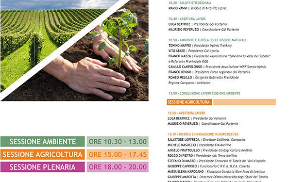 “Gli interventi strategici del Gal Partenio a favore dell’innovazione in agricoltura e a tutela dell’ambiente”, questo il titolo della giornata i cui si svolgeranno in due sessioni, una mattutina (10.00– 13.00) in cui si parlerà di ambiente e tutela delle risorse naturali ed una pomeridiana (15.00 – 17.45) nel corso della quale si discuterà di ricerca e innovazione in agricoltura e di agricoltura sociale.