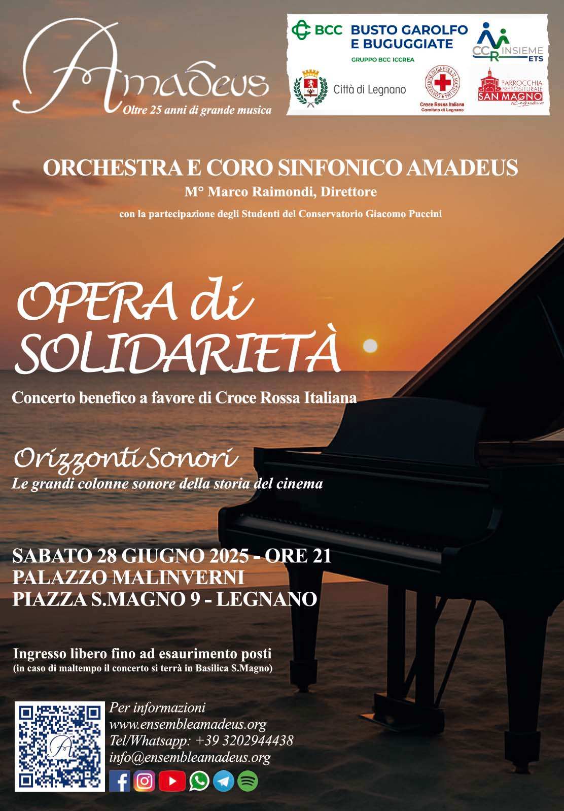 Sarà una serata di grande musica e generosità quella di sabato 28 giugno 2025 alle ore 21, nel cortile di Palazzo Malinverni a Legnano (in caso di maltempo nella Basilica di San Magno). L’Orchestra e il Coro Sinfonico Amadeus, diretti dal Maestro Marco Raimondi, proporranno il concerto benefico Orizzonti Sonori, un viaggio musicale attraverso le più celebri colonne sonore della storia del cinema, un programma adatto anche alle famiglie. Tra i musicisti ci saranno anche gli studenti del Conservatorio Giacomo Puccini, che grazie dall’impegno di Amadeus da tre anni possono ora dare gli esami nella sede lodale dell’associazione musicale per i primi 5 anni di corso. L’ingresso è libero fino a esaurimento posti, con prenotazione consigliata.