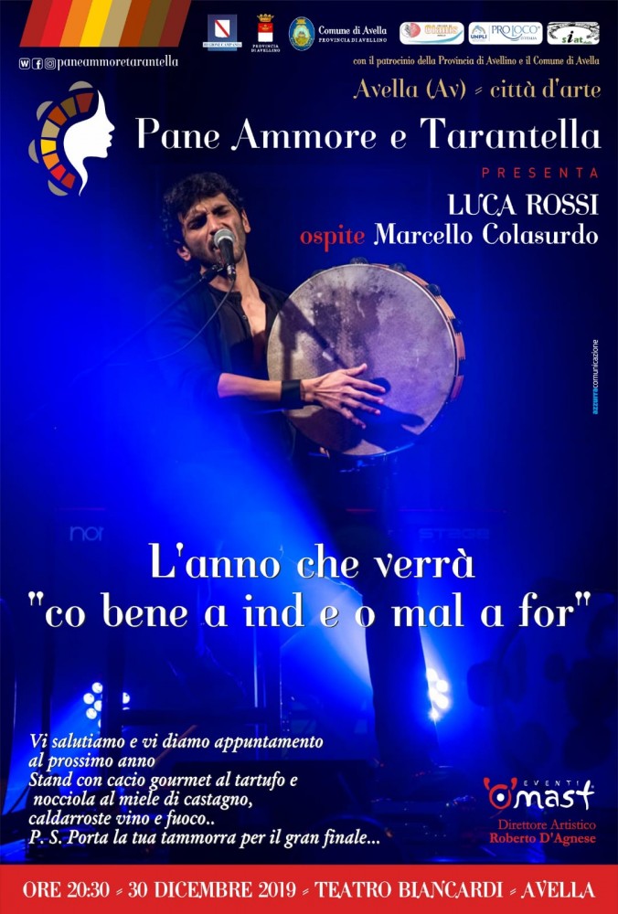 AVELLA (AVELLINO) – Gran finale per l’ottava edizione di “Pane Ammore e Tarantella”: Oggi in programma uno spettacolare concerto di fine anno ad Avella (Avellino). Sul palco del Teatro Biancardi, alle ore 20,30, salirà Luca Rossi, con ospite Marcello Colasurdo. Il concerto saluterà il vecchio anno e darà il benvenuto al nuovo, “co’ bene a ind’ e ‘o male ‘a for’”, con la direzione artistica di Roberto D’Agnese per Omast Eventi. Ad arricchire l’evento, stand con cacio gourmet al tartufo e nocciola al miele di castagno, caldarroste, vino e fuoco. Tutti sono invitati a contribuire al gran finale portando da casa la propria tammorra, per un concerto unico che scrive una pagina importante della tradizione della tammurriata.