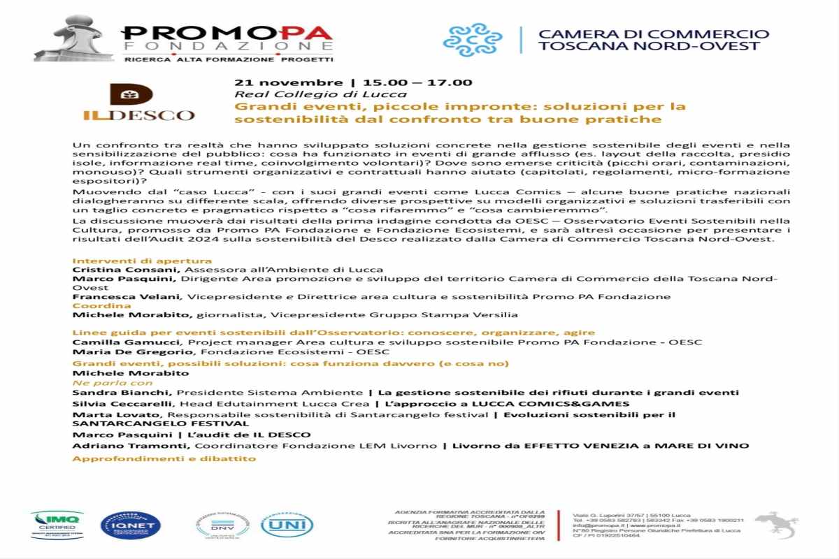 “Grandi eventi, piccole impronte: soluzioni per la sostenibilità dal confronto tra buone pratiche”: è questo il titolo della tavola rotonda organizzata dalla Camera di Commercio della Toscana Nord-Ovest in collaborazione con Promo PA Fondazione, che si i terrà a Lucca venerdì 21 novembre, dalle 15.00 alle 17.00. L’incontro sarà dedicato alla sostenibilità nella gestione degli eventi e si svolgerà negli spazi storici del Real Collegio all’interno della tre giorni de Il Desco, la manifestazione dedicata alle eccellenze enogastronomiche del territorio, punto di riferimento per la valorizzazione delle produzioni locali e della cultura del cibo, che ogni anno accoglie centinaia di visitatori.