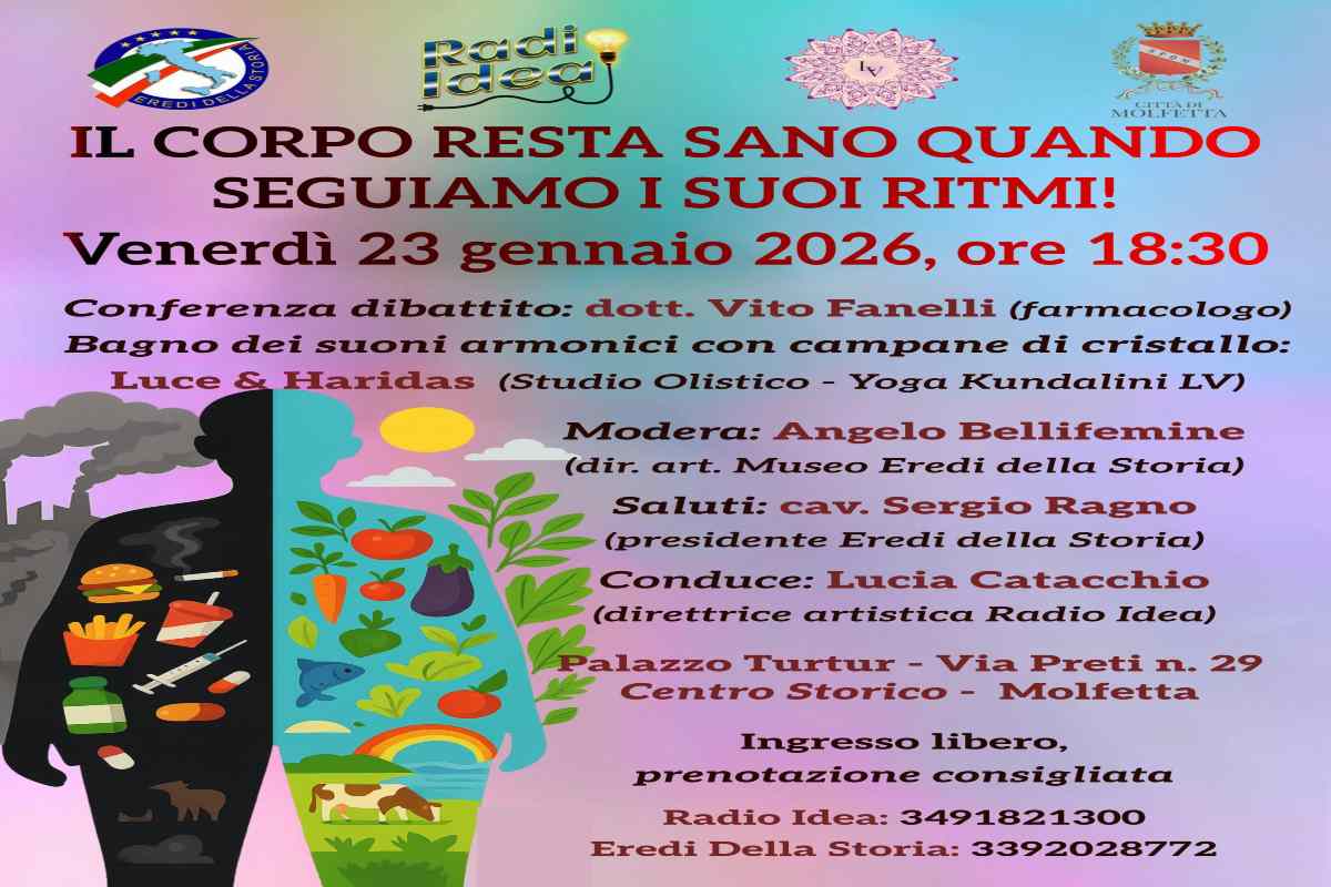 Non è uno slogan new age, ma una constatazione sempre più supportata dalla ricerca scientifica e dall’esperienza clinica. Da questa consapevolezza nasce la conferenza-dibattito organizzata da Radio Idea e Eredi della Storia con il patrocinio del Comune di Molfetta in programma venerdì 23 gennaio 2026 alle ore 18:30, presso Palazzo Turtur, via Preti n. 29, nel centro storico di Molfetta.