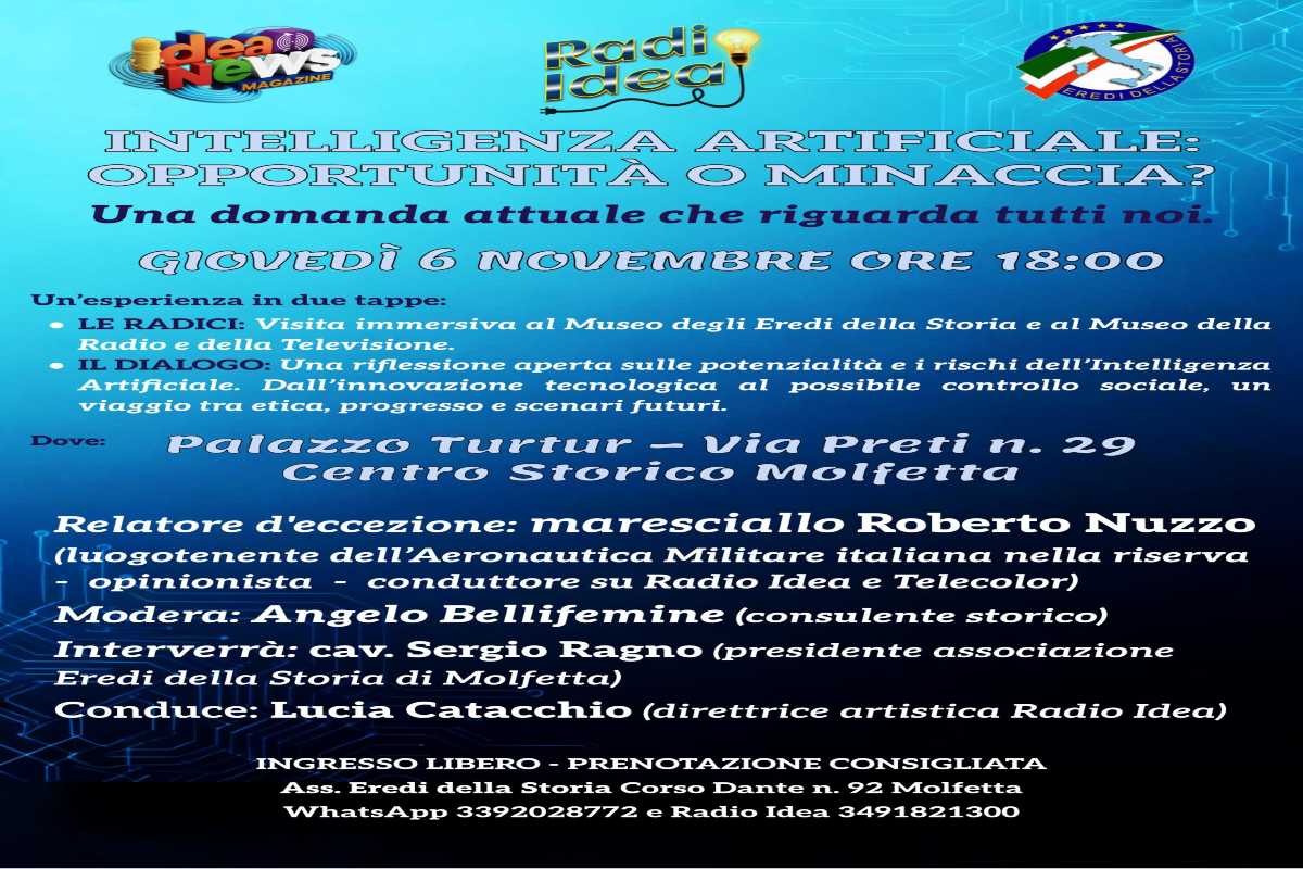 Dopo il successo della conferenza dedicata alla pace mentale, fisica e sociale, che ha richiamato grande attenzione per la profondità dei temi affrontati, Radio Idea ed Eredi della Storia tornano a Palazzo Turtur con un nuovo appuntamento dal titolo emblematico: “Intelligenza Artificiale: Opportunità o Minaccia?”, in programma giovedì 6 novembre alle ore 18.00 nel cuore del centro storico di Molfetta.