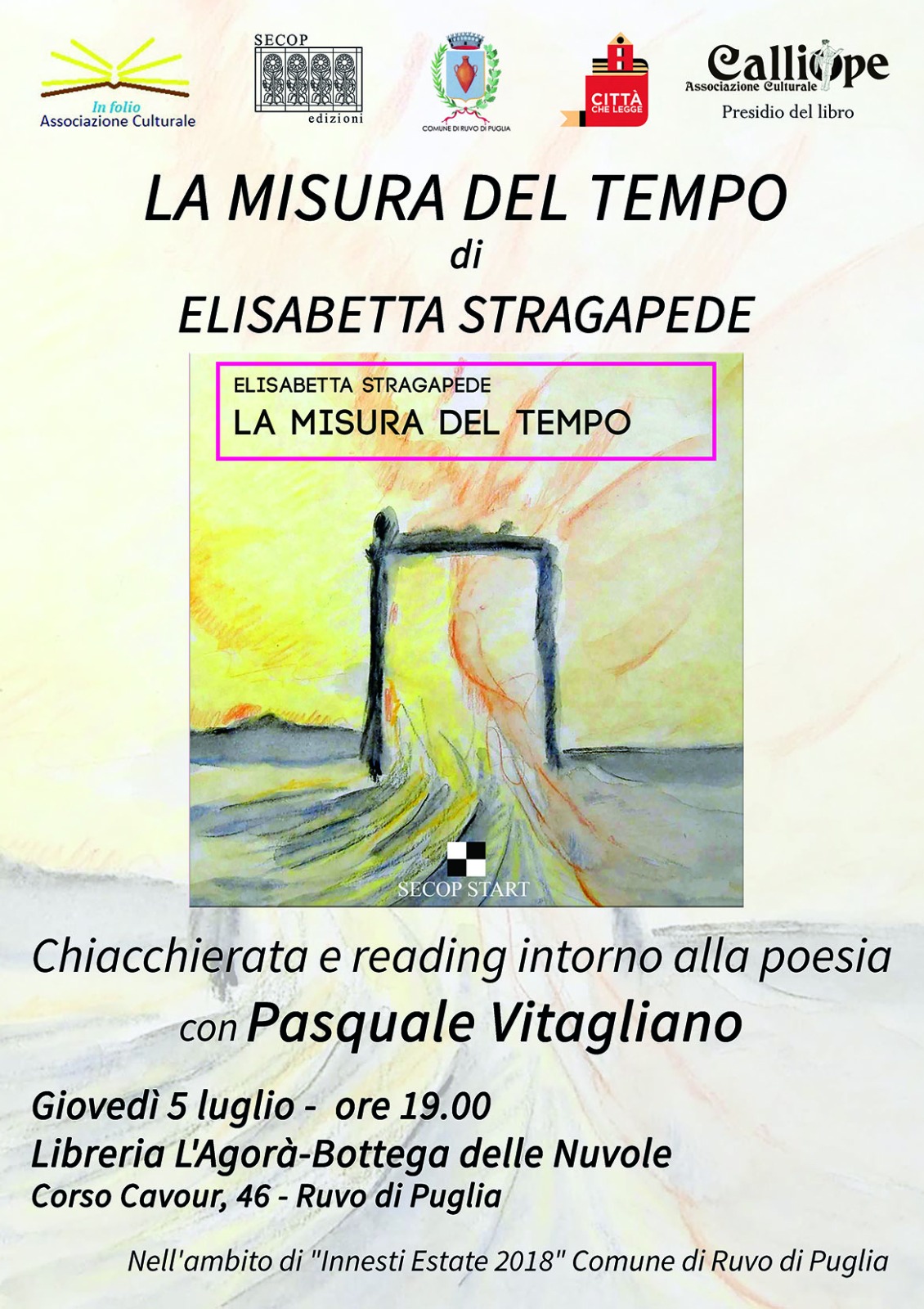 La Misura del Tempo di Elisabetta Stragapede in cammino poetico fa tappa a Ruvo di Puglia. L’associazione culturale Calliope Presidio del libro in collaborazione con In folio Associazione Culturale, con il patrocinio del Comune di Ruvo di Puglia Città che legge Assessorato alla Cultura, nell’ambito di Innesti Estate 2018, incontrano la silloge d’esordio della ruvese Elisabetta Stragapede, vincitrice di TALENTo da Poeta edizione 2017 e pubblicata da SECOP Edizioni. Un viaggio emozionale nei tempi della vita, delle relazioni umane, del legame con la propria terra. Una riflessione intorno all’esistenza di ciascuno di noi e del fluire del tempo che disegna storie in continuo cambiamento.