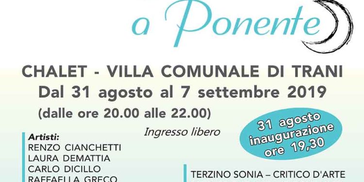 Dal 31 agosto al 7 settembre, nello chalet della villa comunale di Trani esporranno vari artisti provenienti da tutta Italia sul tema del paesaggio: Renzo Cianchetti, Laura Demattia, Carlo Dicillo, Raffaella Greco, Stefania Gubbiotti, Norberto Iera, Arkadiusz Sedek, Maria Elisa Imperiali, Pina Leone, Fabiola Matarazzo, Sabatino Muscetta, Marina Oganesyan, Stefano Pannacci, Luigi Pomarico, Anna Rita Rossetti e Antonio Russo Galante.