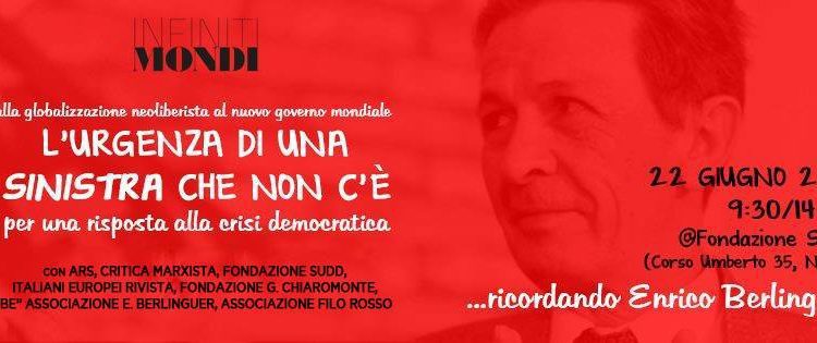 Ieri, venerdì 22 Giugno, a Napoli, presso la sede della Fondazione SUDD, a Corso Umberto 35, avrà luogo il dibattito dal titolo: “…ricordando Enrico Berlinguer. L’urgenza di una sinistra che non c’è per una risposta alla crisi democratica”. Un momento di riflessione comune partendo: “Dalla globalizzazione neoliberista al nuovo governo mondiale.”