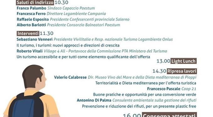 A seguire, esperti del settore di fama nazionale discuteranno dei nuovi scenari su cui si affaccia il mondo del turismo. Aprirà Sebastiano Venneri, presidente Vivitalia e responsabile nazionale Turismo Legambiente Onlus, che curerà un intervento dal titolo “Il turismo, i turismi: nuovi approcci e direzioni di crescita”. A seguire “Un turismo accessibile e per tutti come elementi qualificante dell’offerta”, a cura di Roberto Vitali, presidente di Village 4 All e portavoce della Commissione PTA del Ministero del Turismo. Light Lunch a base di prodotti del Cilento e della Dieta mediterranea e a seguire il direttore del Museo Vivente della Dieta Mediterranea di Pioppi Valerio Calabrese parlerà proprio dell’importanza della valorizzazione della territorialità e dello stile mediterraneo nell’offerta turistica. Seguirà l’intervento di Francesco Pascale della Coop21 su “Buone pratiche e opportunità per una conversione verde”. Infine, Antonio Di Palma, consulente ambientale sulla gestione dei rifiuti, presenterà le sue proposte per un turismo più sostenibile, finalizzato alla prevenzione e riduzione dei rifiuti per un futuro senza plastica.