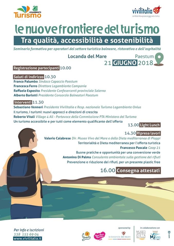 PAESTUM (Salerno). Esplorare nuove forme di accoglienza turistica virtuose e sostenibili: è l’obiettivo del seminario formativo “Le nuove frontiere del turismo. Tra qualità, accessibilità e sostenibilità”, in programma giovedì 21 giugno 2018 a partire dalle ore 10 alla Locanda del Mare, in via Linora (zona Licinella Torre di Paestum), a Paestum.