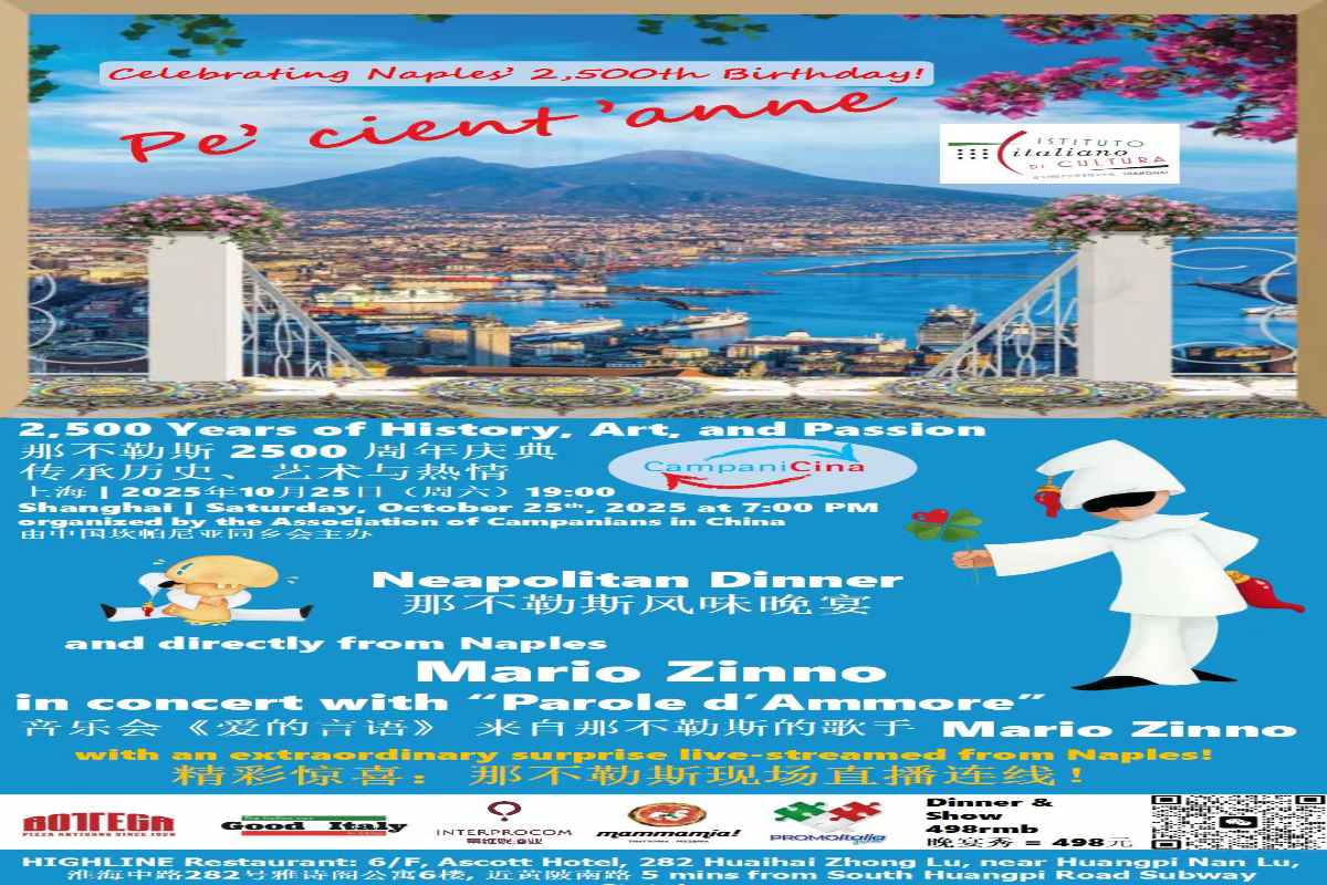 Con una carriera che spazia dal teatro musicale alla televisione, dal ruolo di attore, cantante e musicista a quello di direttore artistico e produttore esecutivo, Mario Zinno per l’occasione propone un repertorio della canzone classica napoletana da Funiculì funiculà a Dicitencelle vuje, da ‘A vucchella a Marechiaro, da Santa Lucia luntana a ‘O surdato ‘nnammurato, evocando la ricca storia e cultura di Napoli. Un viaggio tra canzoni e racconti che porterà a Shanghai il cuore autentico della città partenopea.