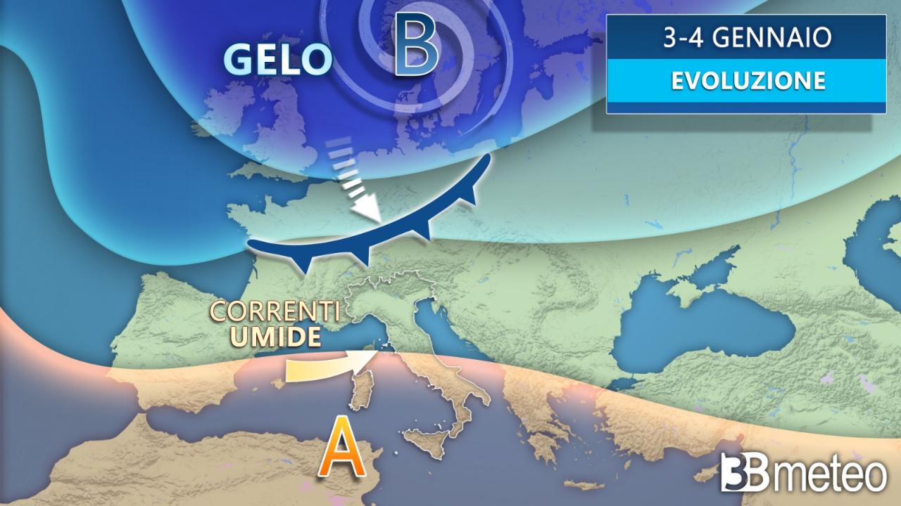 SITUAZIONE. Il vaso anticiclone insediatosi alla fine dell’anno sull’Europa centro-meridionale continua a perdere colpi in corrispondenza del suo perimetro settentrionale, attaccato dai primi fronti atlantici che iniziano a scendere di latitudine e raggiungo il centro del Continente. Ad orchestrare la loro discesa è una dinamica circolazione di bassa pressione collocata sul Mar di Norvegia, alimentata da aria molto fredda di matrice artica, destinata ad estendersi verso le isole britanniche prima e l’Europa sudoccidentale entro mercoledì. Sull’Italia prevale però ancora l’azione stabilizzante dell’anticiclone, anche se comporta la presenza di nebbie e nubi basse diffuse sulla Pianura Padana, ma anche sul Tirreno. Proprio queste ultime sono attivate da una circolazione occidentale umida ancora debole, ma in grado di dar luogo anche alle prime deboli piogge sul Tirreno settentrionale. Entro le prossime 48 ore si farà sempre più deciso e le piogge, seppur deboli, si organizzeranno su parte del versante tirrenico e del Nord, precedendo l’arrivo di una perturbazione nord atlantica mercoledì, in grado di smantellare definitivamente l’anticiclone. Ma vediamo quali saranno le novità del tempo per oggi e i prossimi giorni:
