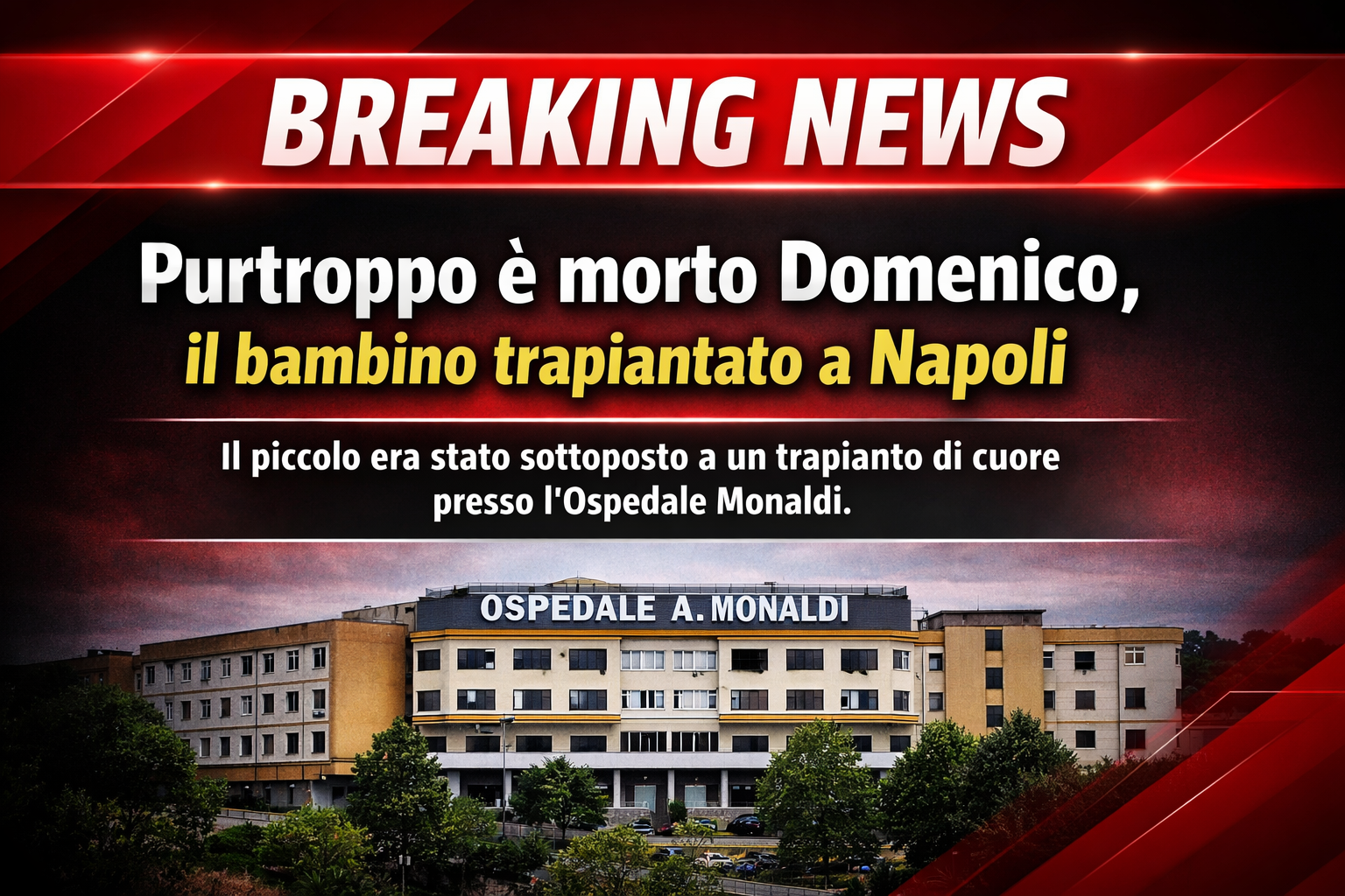 NAPOLI – Non ce l’ha fatta Domenico, il bambino sottoposto due mesi fa a un delicato trapianto di cuore e ricoverato presso l’Ospedale Monaldi. Il decesso è stato confermato dopo ore di grande apprensione e aggiornamenti sulle sue condizioni, che negli ultimi giorni erano apparse sempre più critiche.