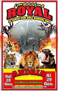 Per la prima volta ad Andria, il famoso “Imperial Royal Circus” tra i più grandi d’Italia, dal 20 al 29 gennaio, lo show da sold out nelle precedenti piazze pugliesi da Taranto a Lecce e Brindisi a Foggia per le festività natalizie, il maestoso show da record, con attrazioni esotiche, dall’elegante giraffa ai reali, ai giganti della savana, vanta di 100 esemplari, artisti internazionali, esibizioni estreme e tanto divertimento con il celebre Clown Ridolini. La grande carovana circense, realmente porta con sè, un centinaio di straordinari esemplari che vivono nel rispetto e nell’amore della grande famiglia circo Imperial Royal Circo. Uno spettacolo pluripremiato e visto da oltre 2 milioni di persone in diverse Nazioni.