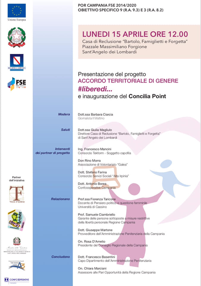 Promuovere un sistema territoriale integrato di interventi e misure che favoriscano la conciliazione tra tempi di vita e di lavoro per le donne e ne alleggeriscano i carichi familiari per sostenere la loro piena partecipazione alla vita civile. È questo l’obiettivo che si pone il progetto #liberedi…, finanziato dalla Regione Campania nel quadro dell’Accordo Territoriale di Genere, che vede coinvolti diversi soggetti sociali e istituzionali sul territorio altirpino. Tra questi il Consorzio Servizi Consorzio Servizi Sociali Alta Irpinia, il Consorzio Tekform, l’Associazione di volontariato Galea, Confcooperative Campania e la Casa di Reclusione di Sant’Angelo dei Lombardi.